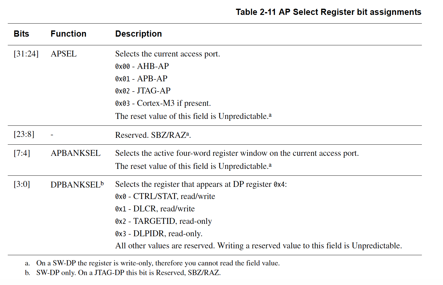The most common type of Access Port is known as the MEM-AP which exposes an interface to different Memory buses available on a given ARM chip. On ARM Cortex-M, the MEM-AP which is typically accessed is known as the AHB-AP. The default APs that are selected can be found in the APSEL part of the DP AP Select Register1: