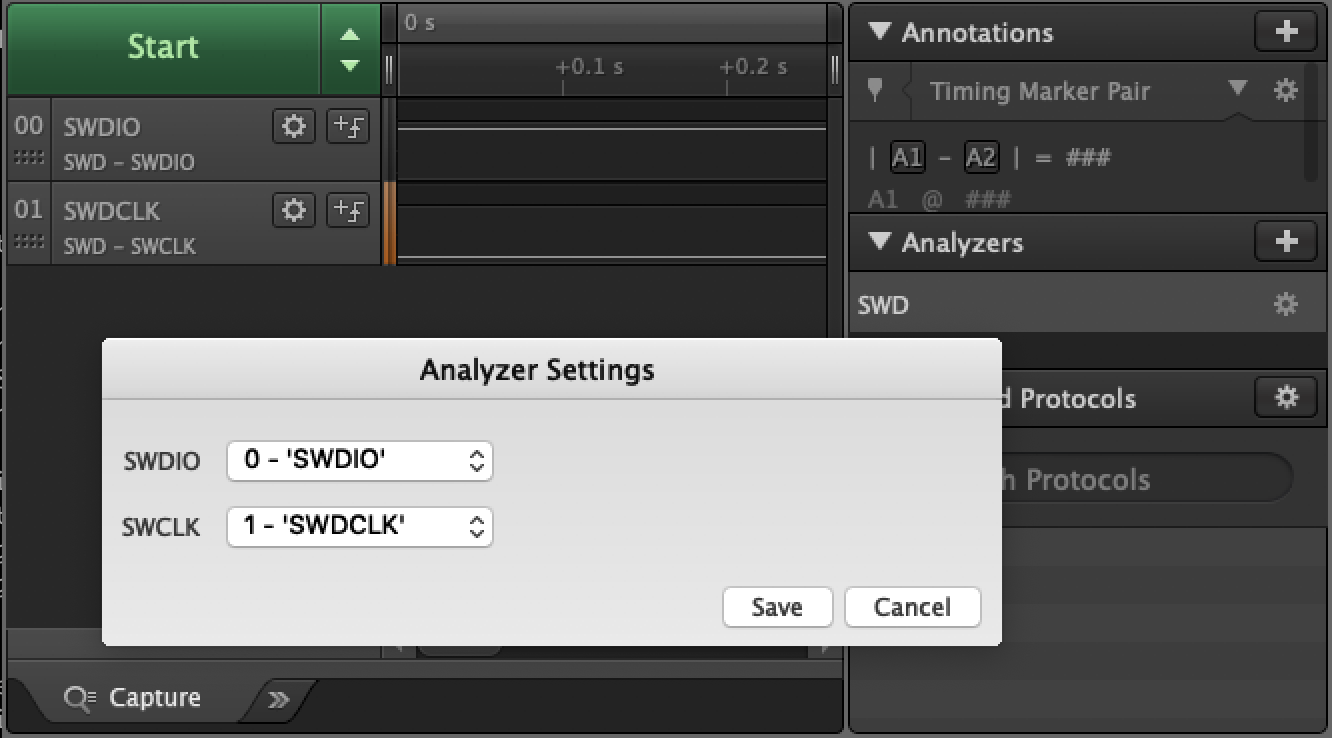 In the Saleae Logic App, I then enabled these 2 pins, and added the SWD analyzer: