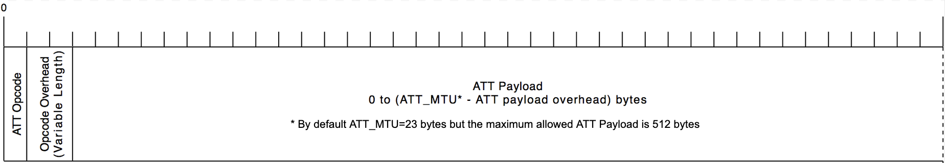 The Attribute Protocol Handle Value Notification is the best way for a server to stream data to a client when using GATT. The Opcode Overhead for this operation is 2 bytes. That means there are 3 bytes of ATT packet overhead and 4 bytes of L2CAP overhead for each ATT payload. We can determine the max ATT throughput by taking the maximum raw Link Layer throughput and multiplying it by the efficiency of the ATT packet: