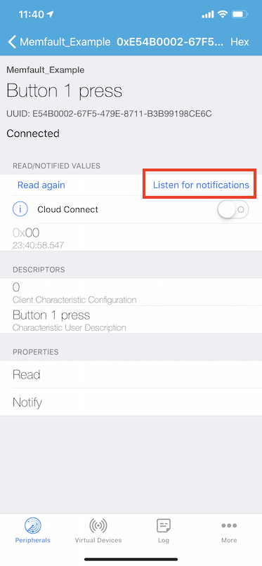 To verify that we can read the value of the Button 1 Characteristic, we can tap on “Read again”. To verify further, we can hold down Button 1 on the development board and then click “Read again”. This time it should display a value of 0x01.