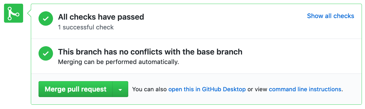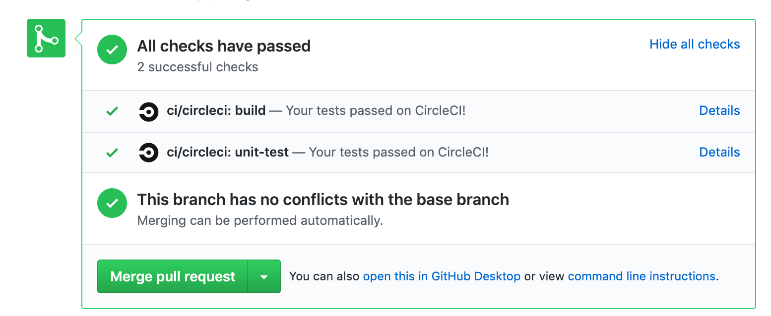 CircleCI will notice the pull request, pick up the new config.yml file and start running our build. If all goes well, we will see “All checks have passed” in Github: