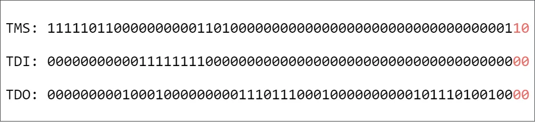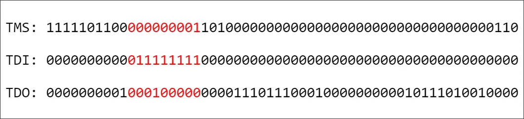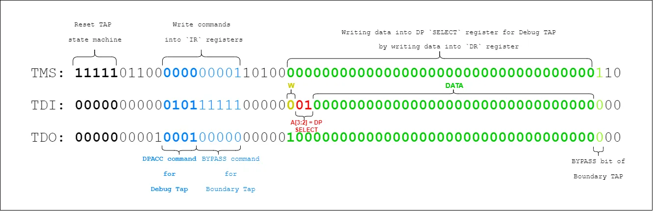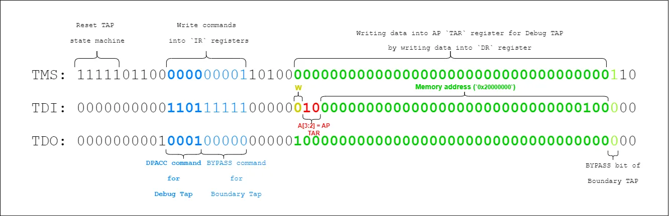 In the following two sections, I will be heavily referencing the “Practical Part” from the article A Deep Dive into the ARM Debug Access Port. This section describes the algorithm for reading/writing memory through interaction with the DAP module. Additionally, I will supplement this algorithm with a sequence of bits, illustrating how this will appear from the perspective of the JTAG protocol.