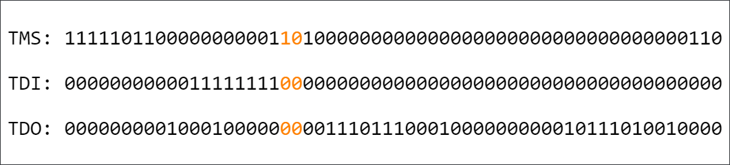 • Great, the necessary commands are set in the IR registers and now we need to return to the Run Test/Idle state for further work. At this point, thanks to the last 1 on the TMS line we are in the Exit-1-IR state and hence according to the state diagram we need to set the following bit sequence on the TMS line to Run Test/Idle: [1, 0]. The orange bit sequence is responsible for this step: