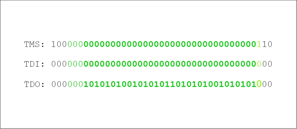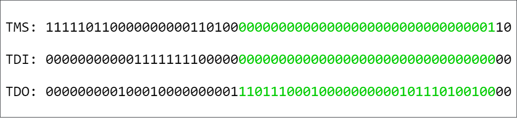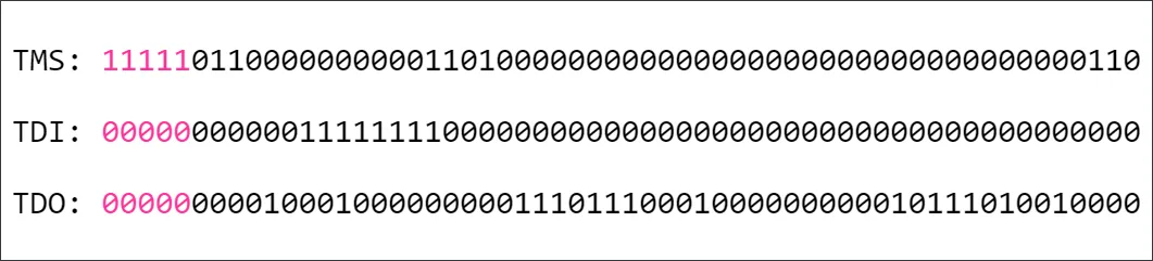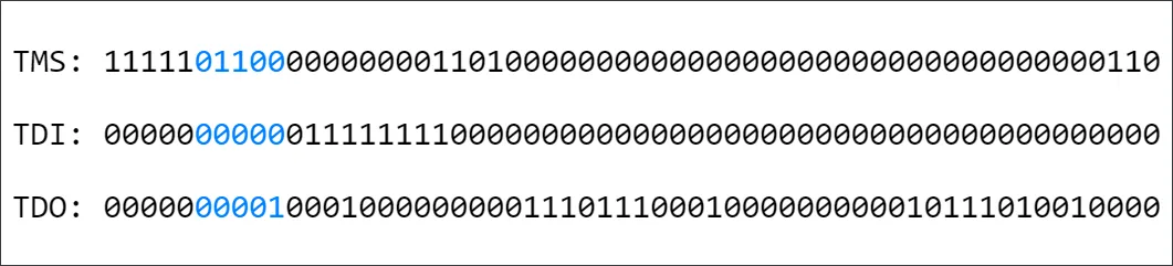 • Next, we need to load the IDCODE command code into the IR register, and to do this we put the TAP State Machine into the Shift-IR state. To do this, feed the TMS line with the sequence [0, 1, 1, 0, 0]. A sequence of blue bits is responsible for this step: