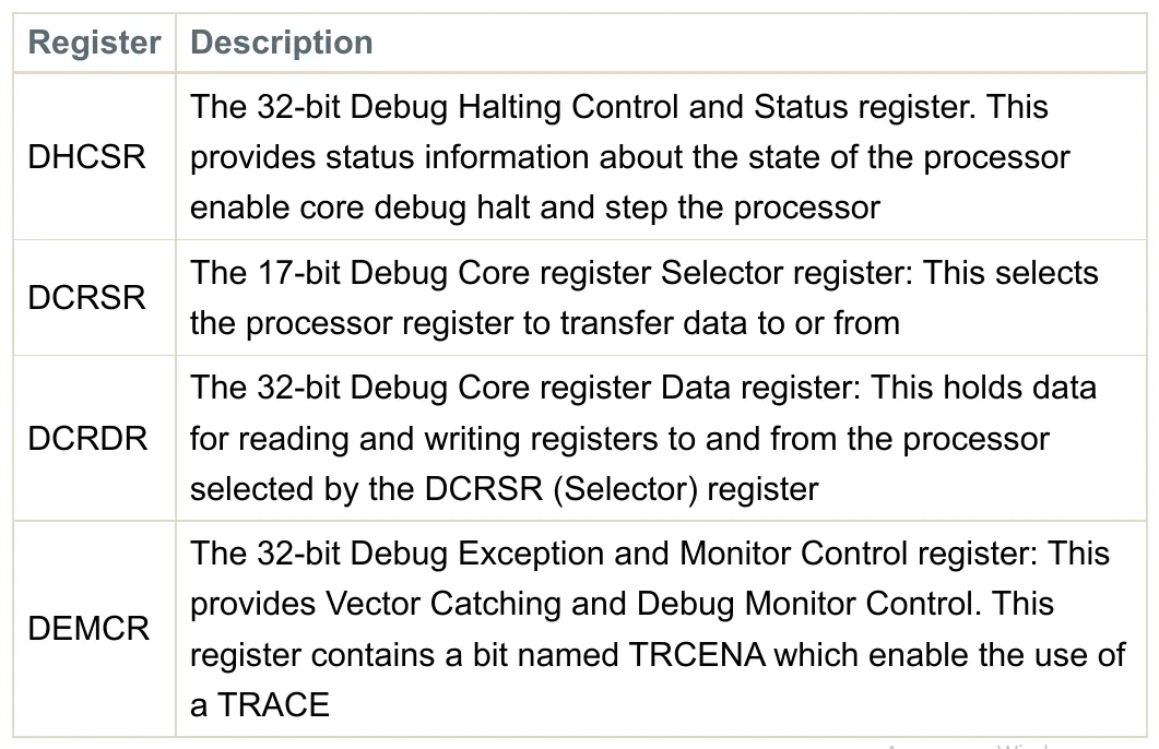 As detailed in section C1.6 Debug system registers of the ARMv7-M Architecture Reference Manual, these registers play a pivotal role in debugging.