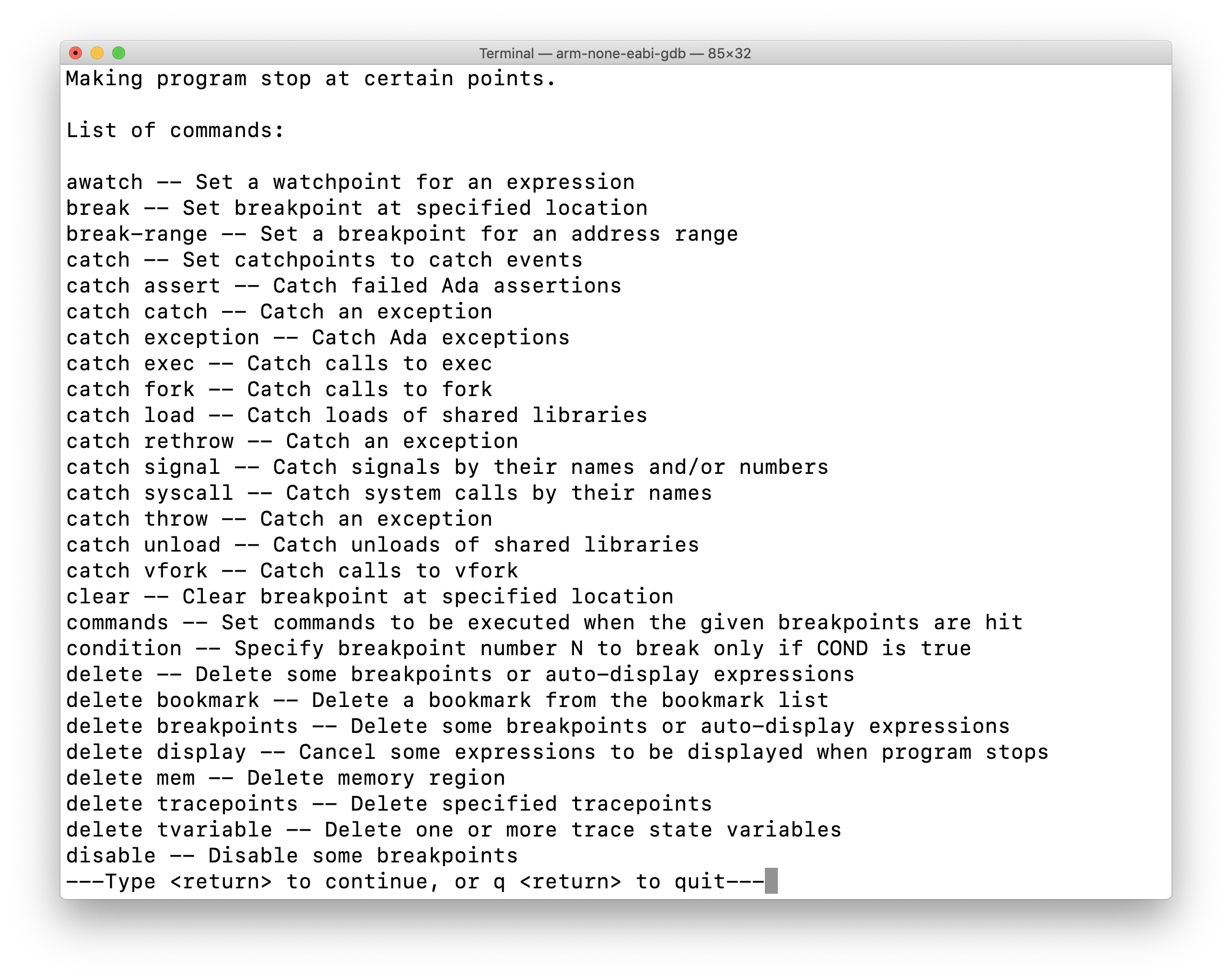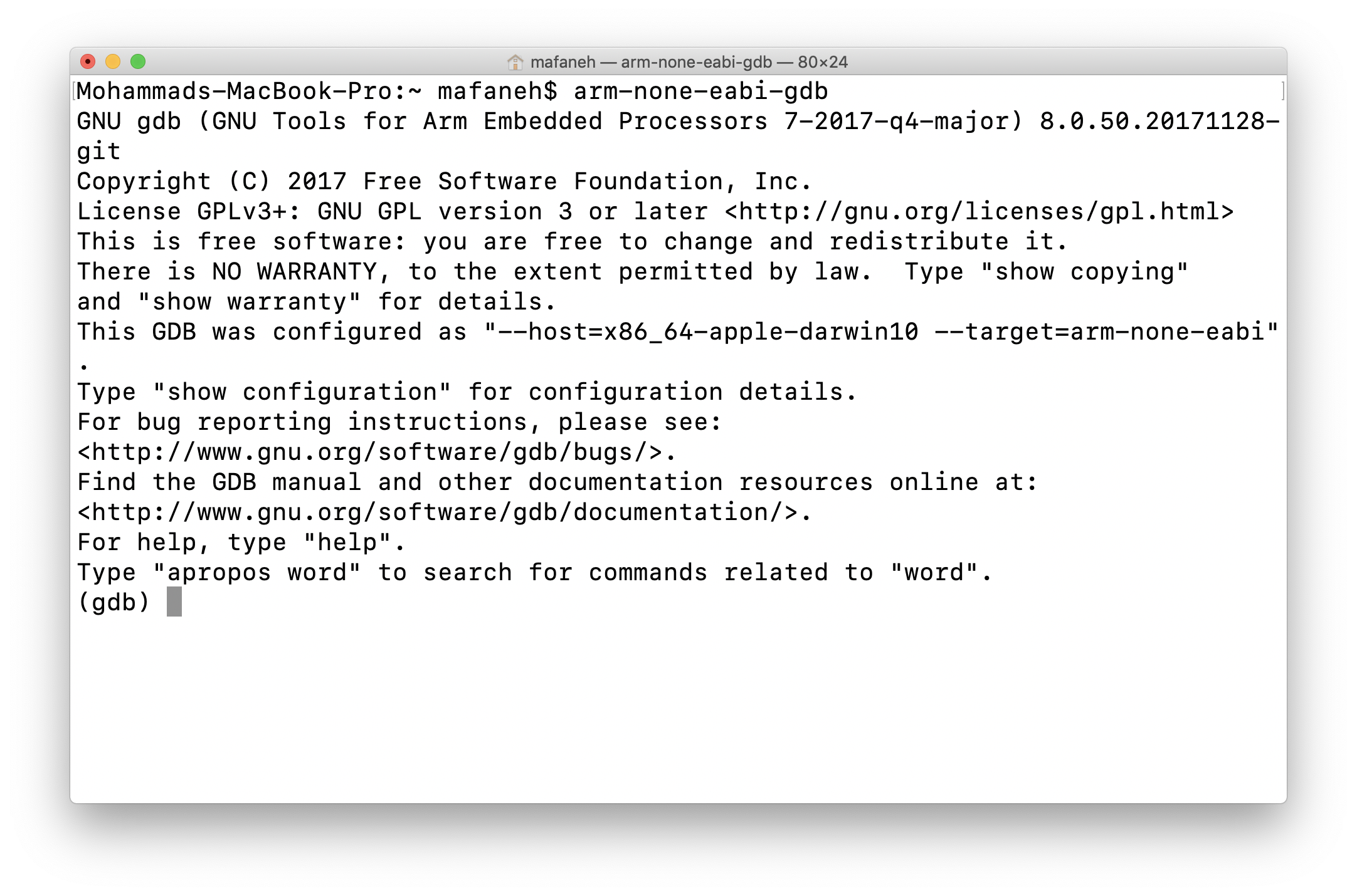 arm-none-eabi-gdbprogram included as part of the GNU Arm Embedded Toolchain we downloaded earlier.To make things easier, run the following command from the output folder where the binary images for the compiled example are located (